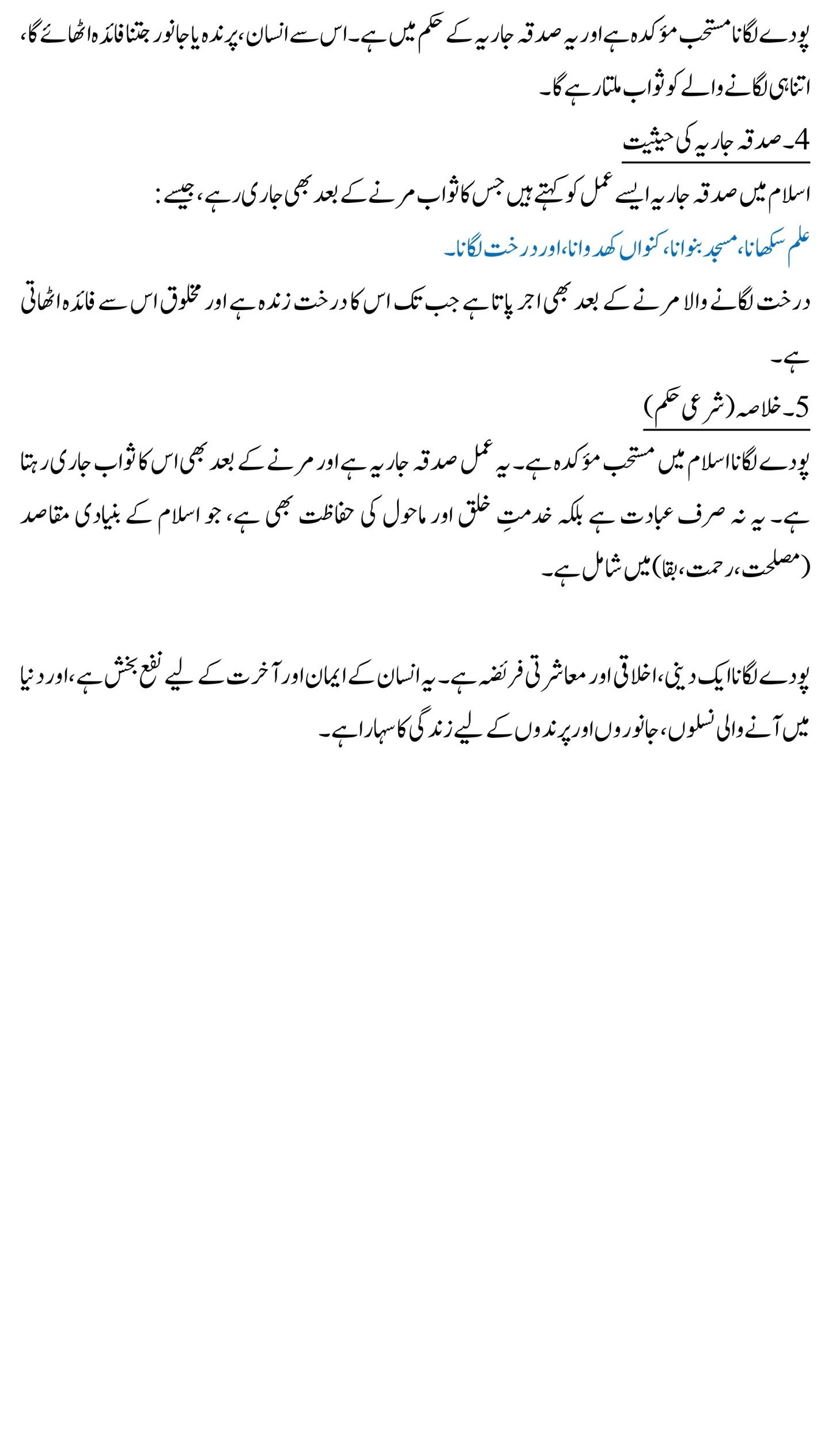 Plantation is considered Mustahabb Mu’akkadah (a highly recommended act) and falls under the category of Sadaqah Jariyah. Every time a human, bird, or animal benefits, the planter continues to receive reward.